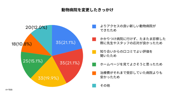 【43.9%がかかりつけ動物病院を切り替えた経験あり。切り替え理由は「近隣に新病院」「スタッフの応対」「口コミ」など多岐。】